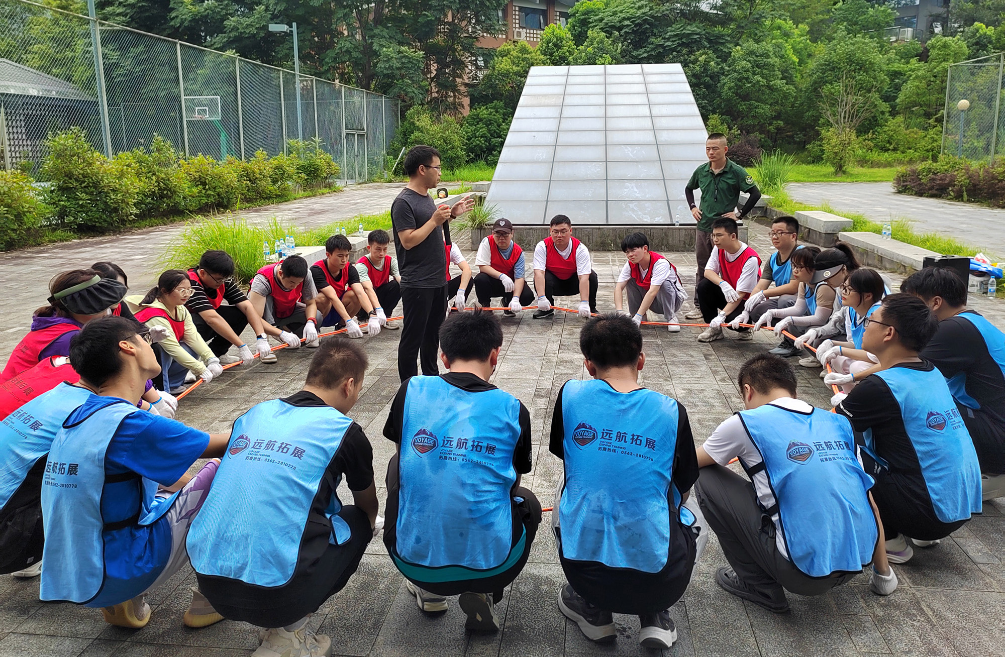 拓展培訓活動在教練的專業(yè)指導下有序進行:新入職大學生分為2個小組,由組長牽頭合作創(chuàng)建了屬于自己的團隊,為各自的團隊設(shè)計隊名、隊歌、隊旗及口號,并共同完成瘋狂市場、急速60秒、雙解碼及生命動力圈等一系列活動。