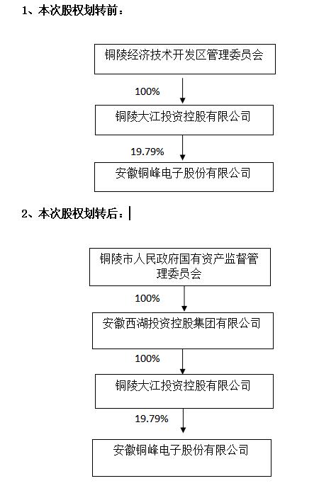 安徽銅峰電子股份有限公司(以下簡(jiǎn)稱“本公司”或“公司”)于 2022 年9月16日收到控股股東銅陵大江投資控股有限公司(以下簡(jiǎn)稱“大江投資”)的通知,為優(yōu)化國(guó)有資產(chǎn)配置,經(jīng)銅陵市人民政府批準(zhǔn),擬將公司實(shí)際控制人銅陵經(jīng)濟(jì)技術(shù)開發(fā)區(qū)管理委員會(huì)(以下簡(jiǎn)稱“銅陵經(jīng)開區(qū)管委會(huì)”)持有的控股股東大江投資100%股權(quán)劃轉(zhuǎn)至安徽西湖投資控股集團(tuán)有限公司(以下簡(jiǎn)稱“西湖投資”)。2022 年 9月16日,銅陵經(jīng)開區(qū)管委會(huì)與西湖投資已就本次國(guó)有股權(quán)劃轉(zhuǎn)事項(xiàng)簽署了《關(guān)于銅陵大江投資控股有限公司之股權(quán)無償劃轉(zhuǎn)協(xié)議》。上述股權(quán)劃轉(zhuǎn)事項(xiàng)尚需辦理工商變更手續(xù)。